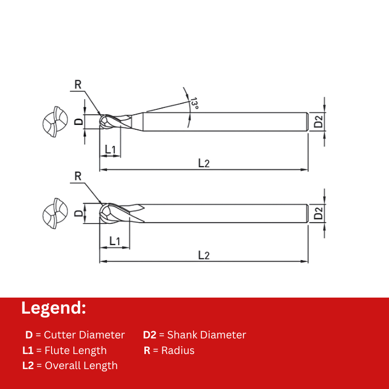 A versatile cutting tool designed for precision milling operations. With its ball nose shape and 2-flute configuration, this end mill is well-suited for creating smooth contours and intricate details on a variety of materials. The carbide construction ensures excellent durability and heat resistance, allowing for prolonged use and consistent performance. The 2-flute design provides efficient chip evacuation, reducing the risk of chip clogging and improving cutting efficiency.