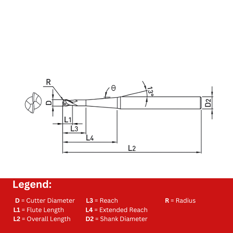 A specialized cutting tool designed for precise and efficient milling operations. Its unique tapered neck design allows for extended reach and access to tight spaces, making it ideal for intricate and complex machining tasks. The ball nose shape and 2-flute configuration enable smooth and accurate contouring, profiling, and finishing operations on a variety of materials. The carbide construction ensures exceptional durability and heat resistance, enabling the end mill to withstand high-speed cutting and prolonged use without compromising performance. With its tapered neck design, the DB342 offers enhanced stability and reduced vibration during machining, resulting in improved surface finish and dimensional accuracy.