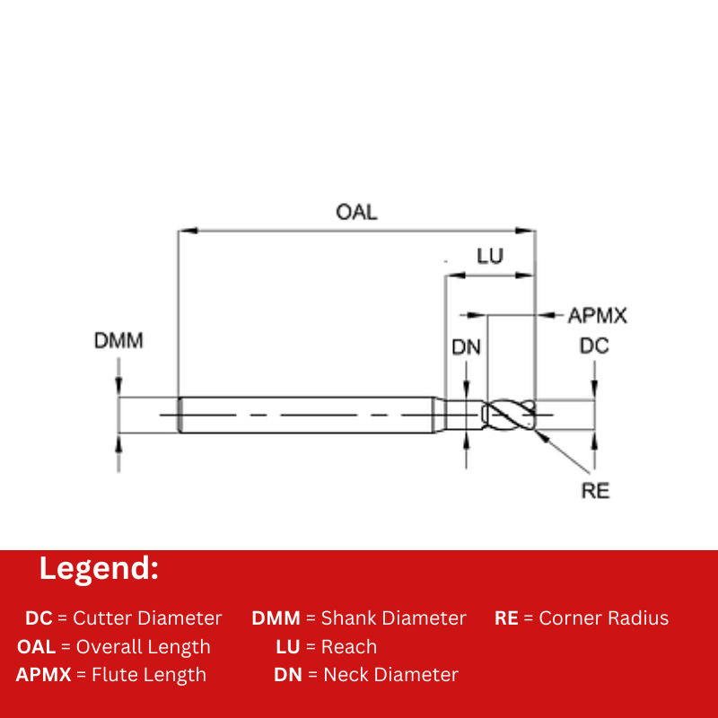 The Europa Tools Carbide End Mill 4 Flute Corner Radius - Extended Neck - Pulsar DMX is designed for precision machining in hard-to-reach areas. The Corner Radius enhances tool strength and minimizes chipping, providing smoother cuts during operations. With its 4 flutes, this end mill improves chip evacuation and delivers excellent surface finishes. The Extended Neck allows for access to deep cavities and complex geometries. Coated with Pulsar for optimized dry cutting and DMX, specifically engineered for high-speed machining of pre-hardened steels up to HRc55, this tool is ideal for engineers requiring both precision and durability in demanding applications.